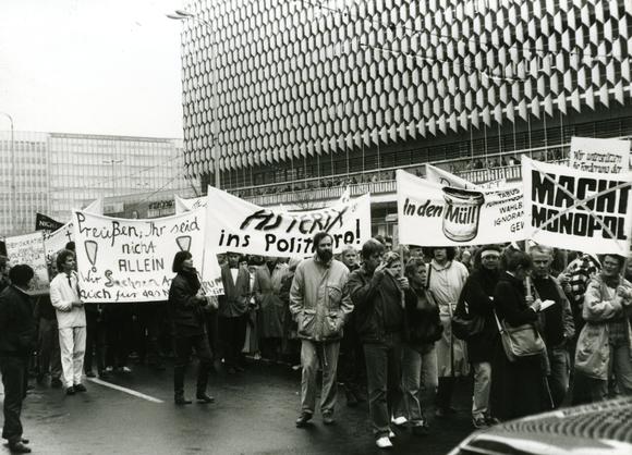 Demonstranten mit Transparenten in der Karl-Liebknecht-Straße am Centrum-Warenhaus Berlin Alexanderplatz mit seiner 2004 abgerissenen Aluminium-Wabenfassade bei der Alexanderplatz-Demonstration, der "größte[n] nicht staatlich gelenkte[n] Demonstration in der Geschichte der DDR" (