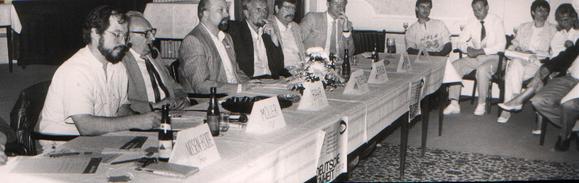 Podiumsdiskussion der "Bürgerinitiative Deutsche Einheit" (BDE), die aus der "Internationalen Gesellschaft für Menschenrechte" (IGfM) hervorging und zu der auch DDR-Übersiedler zählten. Die BDE wurde im Januar 1990 in Schleswig gegründet, um die Opposition in der DDR auf dem Weg zur Wiedervereinigung zu unterstützen.