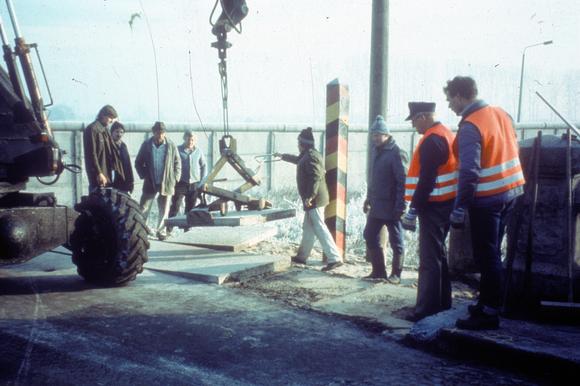 Bauarbeiten vor der Grenzöffnung zwischen dem sachsen-anhaltischen Oebisfelde und Büstedt, einem Ortsteil der Stadt Velpke in Niedersachsen. Am 26. November 1989 wurde die Allerbücke als Straßenverbindung zwischen beiden Ortschaften wieder für den Verkehr geöffnet; im Hintergrund die Grenzmauer