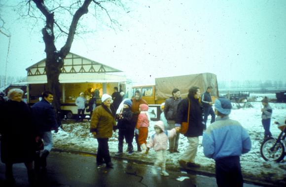 People at a snack stall on 26 November 1989, the day the border opened between Oebisfelde (Saxony-Anhalt) and Büstedt (Lower Saxony)
