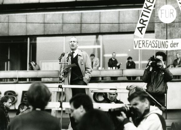 Markus Wolf, head of East German foreign intelligence in front of the Haus des Reisens (House of travel) in Alexander Straße at the Alexanderplatz demonstration, the "largest anti-government demonstration(s) in the history of the GDR" (retrieved and translated from