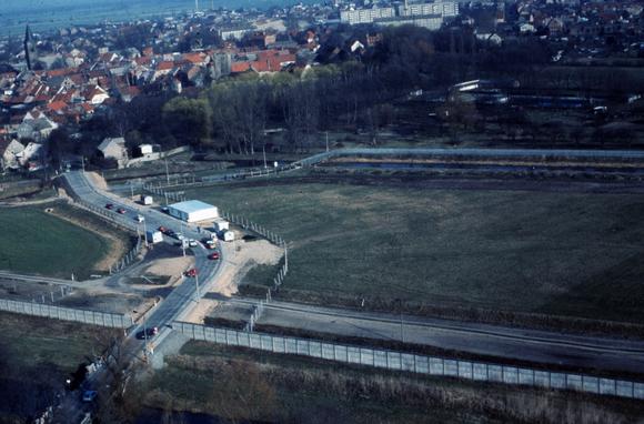 Luftaufnahme des Grenzübergangs zwischen dem sachsen-anhaltischen Oebisfelde und Büstedt, einem Ortsteil der Stadt Velpke in Niedersachsen, der am 26. November 1989 eröffnet wurde