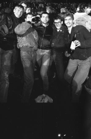 "Überall standen feiernde Kleingruppen herum. Hier junge DDR-Bürger mit ihrer vermutlich ersten französischen West-Weinflasche."