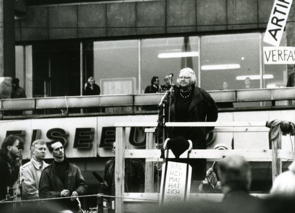 Die Schauspielerin Steffie Spira vor dem Haus des Reisens in der Alexanderstraße bei der Alexanderplatz-Demonstration, der "größte[n] nicht staatlich gelenkte[n] Demonstration in der Geschichte der DDR" (