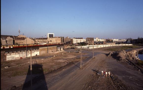 View from a watchtower of the former border strip with Hinterlandmauer (inner Eastern wall), patrol road and illuminated strip