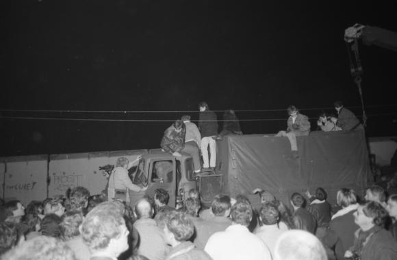 "Unter großem Medienrummel wurden die ersten Segmente der Mauer vor dem Brandenburger Tor abgebaut. Es wurde alles sich bietende genutzt, um eine bessere Sichtposition zu bekommen."