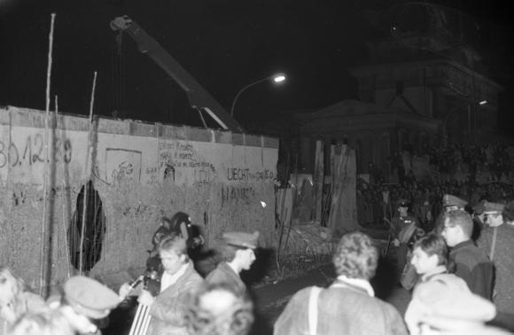 "Media frenzy surrounded the dismantling of the first segments of the Berlin Wall in front of Brandenburg Gate."