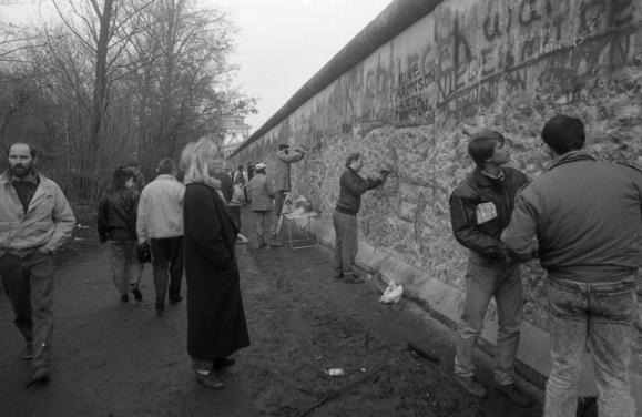 "Der Anfang der Mauerspechte. Zunehmend wurde die Mauer immer löchriger, sie musste dann aus Sicherheitsgründen "von Amts wegen" vom Westberliner Senat entfernt werden."