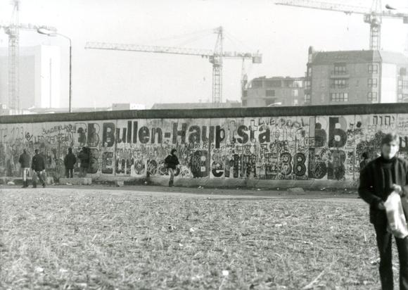 Passanten an der Westseite der Berliner Mauer, im Hintergrund links das Internationale Handelszentrum (IHZ) in Berlin-Mitte