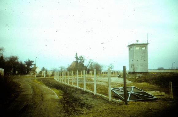 Partially dismantled border facility with a watchtower and border wall close to the border crossing between Oebisfelde (Saxony-Anhalt) and Büstedt (Lower Saxony), that was opened on 26 November 1989