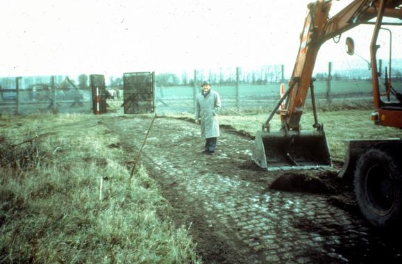 border checkpoint, border fence, excavator, inner German border, man, one person, paving stone
