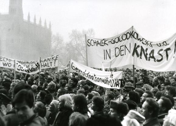 Demonstrators with banners at a rally on 3 December 1989 at which thousands of SED members in Berlin followed the call of the SED delegates conference at the Akademie der Wissenschaften (Academy of Sciences) to appeal for a complete renewal of the SED in front of the SED headquarters (retrieved and translated from