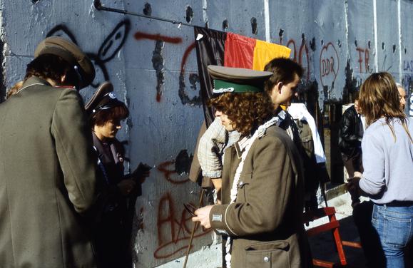 Berlin Wall (East), flag of the GDR, group of people, souvenir, souvenir trade, uniform, Wall graffiti