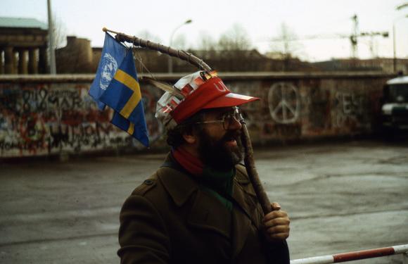 A man with a UN flag and UN cap adorned with other national flags, in front of the West side of the Berlin Wall