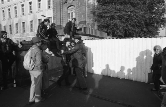 "Neben der Absperrung der DDR-Staatsgrenze an der Invalidenstraße mit Blick in den "Osten"."