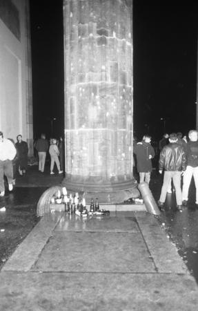 "Early New Year's Eve 1989/1990 at Brandenburg Gate. It rained and the Gate was a wonderful shelter. As time passed the amount of empty champagne bottles rapidly increased. It was difficult to avoid tripping over them."