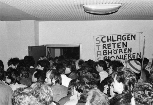 Demonstranten bei der Stürmung der Zentrale des Ministeriums für Staatssicherheit; nachdem seit Dezember 1989 die Gebäude der Staatssicherheit in mehreren Städten der DDR besetzt wurden, stürmten am 15. Januar 1990 Demonstranten die Zentrale in Berlin-Lichtenberg, um die bereits begonnene Vernichtung der Akten zu verhindern. Die Bürgerrechtler, die den Komplex besetzten, begannen mit der Aufarbeitung der Akten. Heute wird dies von der BStU fortgeführt. Siehe auch Der Sturm auf die Stasi-Zentrale, Stand 18. März 2010 und RIAS-Bericht über den Sturm auf die MfS-Zentrale, Stand 1. Oktober 2010