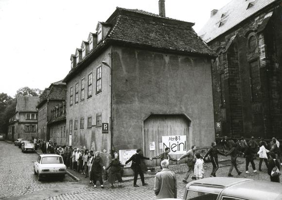 Menschenkette um das Löfflerhaus in Gotha, im Hintergrund die Margarethenkirche; "Am 14. Juni 1990 organisierte die 'Bürgerinitiative zur Altstadtrettung' eine Menschenkette um das abrissgefährdete denkmalgeschützte Löfflerhaus hinter der Margarethenkirche, um ihr Engagement für den Erhalt dieses historischen Gebäudes zu dokumentieren." (Mathias Wenzel: Gotha: Ein Fotoalbum, Erfurt 2003, S. 126)
