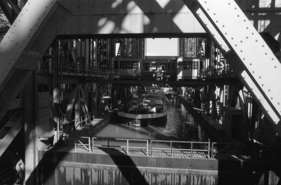 A freight ship inside the Niederfinow lift lock on the Oder-Havel Canal in Brandenburg