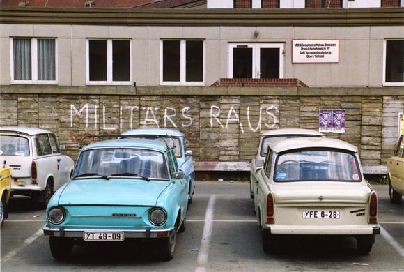 Geparkte Trabant und Grafffiti "Militärs raus"