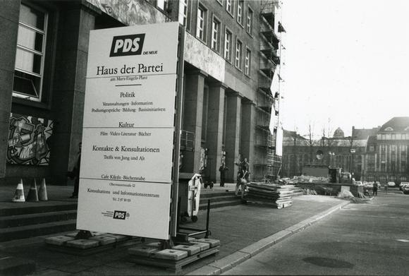 PDS Die Neue / Haus der Partei / am Marx-Engels-Platz / Politik / Veranstaltungen Information / Podiumgespräche Bildung Basisinitiativen / Kultur / Film Video Literatur Bücher / Kontakte & Konsultationen / Treffs von Jung und Alt / Cafe Ki(et)z Bücherstube / Oberwasserstraße 12 / Konsultations und Informationszentrum / Tel. […] / Partei des / demokratischen / Sozialismus / PDS