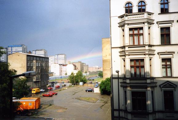 Blick aus der neuen Wohnung auf die Mauer am Checkpoint Charlie