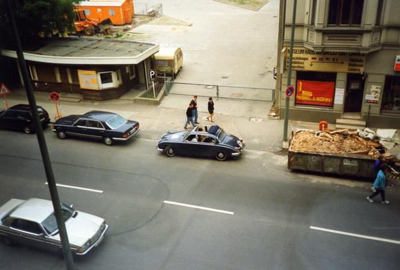 Blick aus der neuen Wohnung auf das Haus am Checkpoint Charlie, während der Zeit der Mauer einer der sieben Straßenübergänge zwischen Ost- und West-Berlin (zwischen sowjetischem und US-amerikanischem Sektor), der von Ausländern, Angehörigen der alliierten Streitkräfte und Diplomaten benutzt werden musste