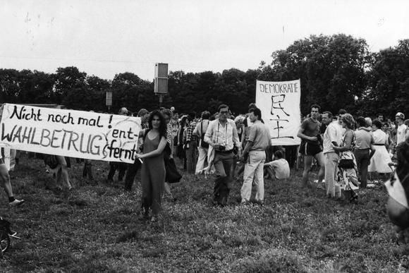 Nach dem Abschlussgottesdienst auf der Leipziger Rennbahn formierte sich eine Demonstration gegen Wahlbetrug und für Demokratie. Die Sicherheitskräfte griffen wegen der anwesenden westlichen Journalisten und Gäste nicht ein. […] In der Peterskirche fand die Aktion mit einer improvisierten Andacht ihren Abschluss." (www.runde-ecke-leipzig.de: 9. Juli 1989: Kirchentag, Stand 19. Oktober 2010)