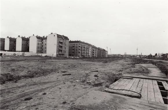 Blick auf den ehemaligen Grenzstreifen in der Schwedter Straße, wo sich heute die Jugendfarm Moritzhof befindet; links sind die Einmündungen in die Kopenhagener und die Korsörer Straße zu sehen, im Hintergrund der Friedrich-Ludwig-Jahn-Sportpark und der Berliner Fernsehturm