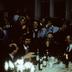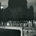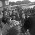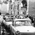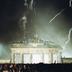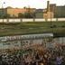 A crowd of people behind barrier tape on the West side of the Berlin Wall; the Hinterlandmauer (inner Eastern wall) and border strip in the background