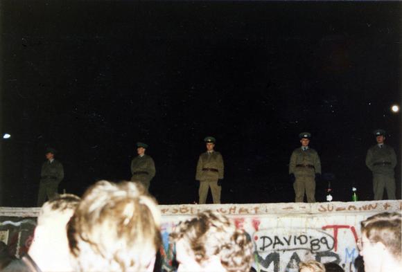 Grenzsoldaten auf der Berliner Mauer am Brandenburger Tor in der Nacht