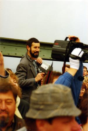 "Ankunft des Bundespräsidenten Richard von Weizsäcker und des Regierenden Bürgermeisters Walter Momper. Bad in der Menge, aber nur bis zum Ortsschild Potsdam, das immerhin von einem strahlenden R von W angefasst wurde."