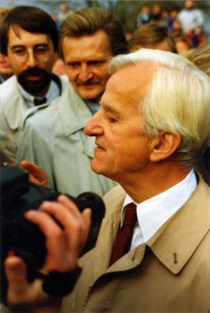 "Ankunft des Bundespräsidenten Richard von Weizsäcker und des Regierenden Bürgermeisters Walter Momper. Bad in der Menge, aber nur bis zum Ortsschild Potsdam, das immerhin von einem strahlenden R von W angefasst wurde."