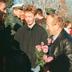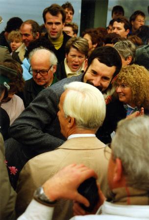 "Ankunft des Bundespräsidenten Richard von Weizsäcker und des Regierenden Bürgermeisters Walter Momper. Bad in der Menge, aber nur bis zum Ortsschild Potsdam, das immerhin von einem strahlenden R von W angefasst wurde."