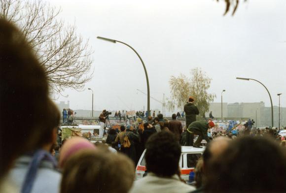 Fernsehteams inmitten einer Menschenmenge bei der Öffnung des Grenzübergangs Potsdamer Platz am 12. November 1989