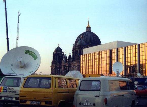 Broadcast vans on the election night of the People's Parliament 1990, the first democratic elections in the GDR