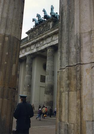 A member of the People's Police as seen from between two columns on the East side of Brandenburg Gate