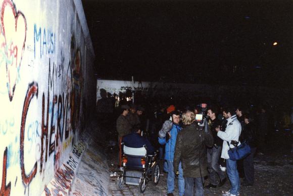 Berliner Mauer (West), Fernsehkamera, Fernsehteam, Fotograf, Grenzsoldat, Grenzöffnung, Mauergraffiti, Menschenmenge, Nacht