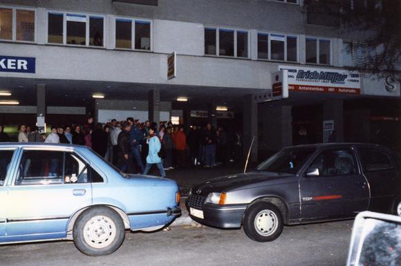 Aufkleber, Auto, Einzelhandelsgeschäft, Mehrere Personen, Schild (Zeichen), Sparkasse, Warteschlange