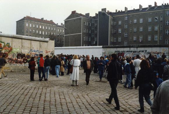 Reger Fußgängerverkehr auf der Westseite des Grenzübergangs Eberswalder Straße/Bernauer Straße, der am 11. November 1989 eingerichtet wurde