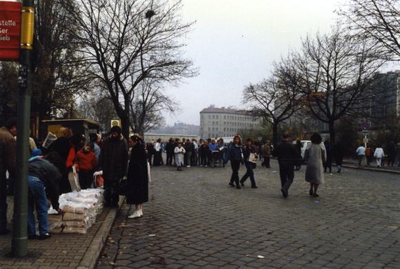 Pedestrians in Bernauer Straße; the Eberswalder Straße/Bernauer Straße border crossing in the background, installed on 11 November 1989