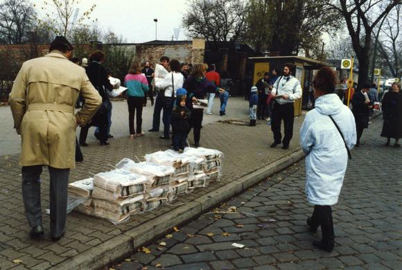 Pedestrians in the West part of Bernauer Straße, close to the Bernauer Strasse border crossing that was installed on 11 November 1989