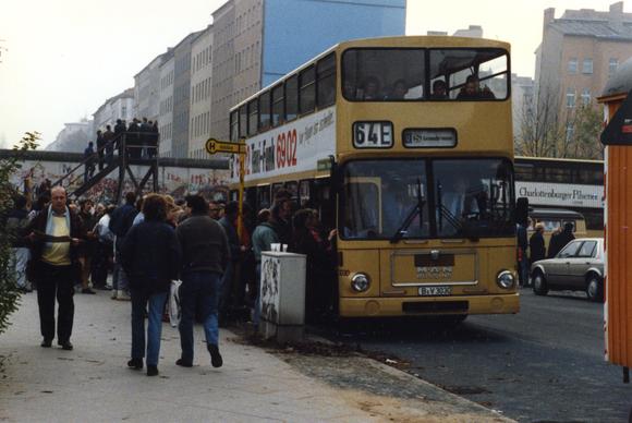 A bus stop on the West side of the Berlin Wall; people on a lookout platform in the background