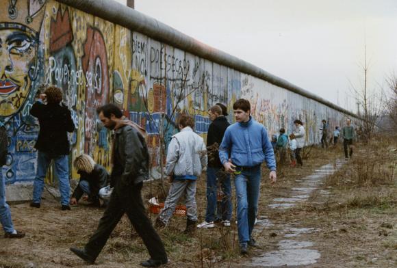 Passanten und Mauerspechte auf der Westseite der Berliner Mauer