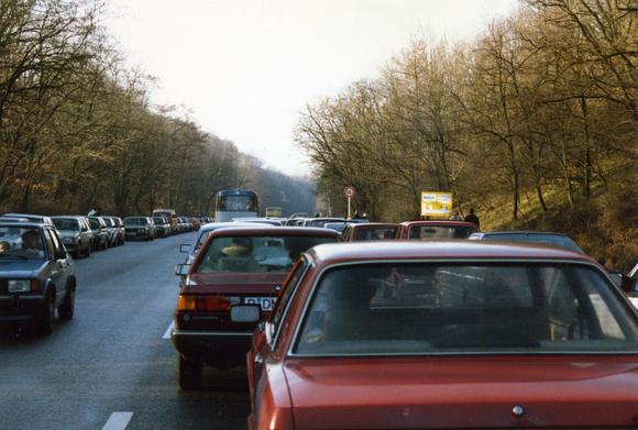 Stau auf der Königstraße Richtung Glienicker Brücke, die über die Havel hinweg die Städte Berlin und Potsdam verbindet und die am 10. November 1989 erstmals seit 1961 wieder für Menschen aus der DDR geöffnet wurde