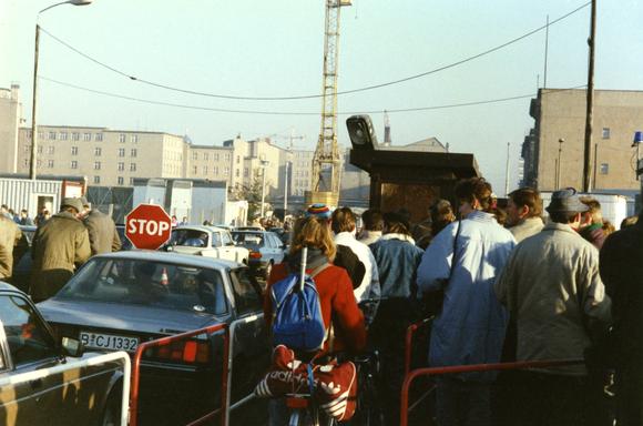 Auto- und Fußgängerverkehr am Grenzübergang Potsdamer Platz, der ab dem 12. November 1989 als neuer Grenzübergang dient