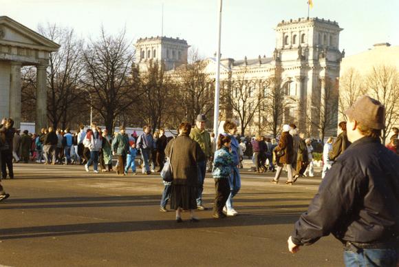 Blick vom Pariser Platz auf den Reichstag, links im Bild das rechte Torhaus des Brandenburger Tors