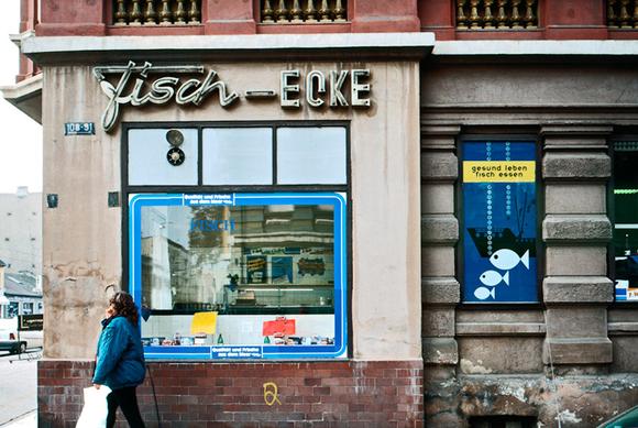 "What a bold advertising style: 'Fish corner' at Halberstädter Straße/Braunschweiger Straße in the Sudenburg district" (from: Stadt im Wandel. Magdeburg zwischen 1990 und 2006, in vergleichenden Fotografien von Werner Klapper, 2. Aufl., Magdeburg: Ost-Nordost Verlag 2007)