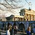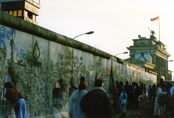Passanten an der stark demolierten Westeite der Berliner Mauer am Brandenburger Tor, links ein Wachtturm