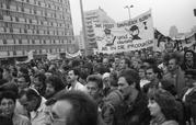 Menschenmenge mit Transparent "I...